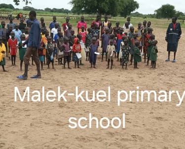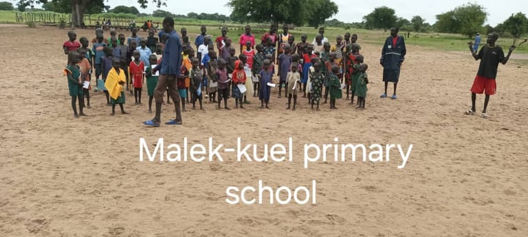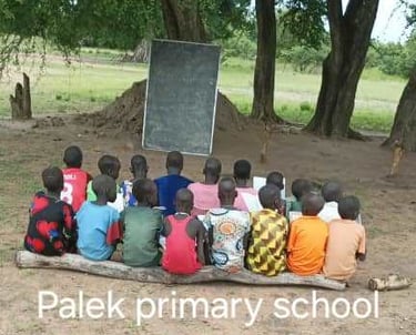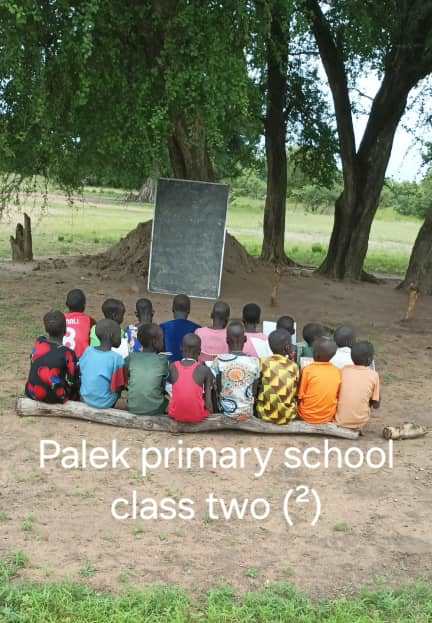 Class two (2) learners of Malek-kuel primary school attending their lessons under a tree. Class 1 -3 pupils share this blackboard on a rotation as there are no classrooms or blackboards.